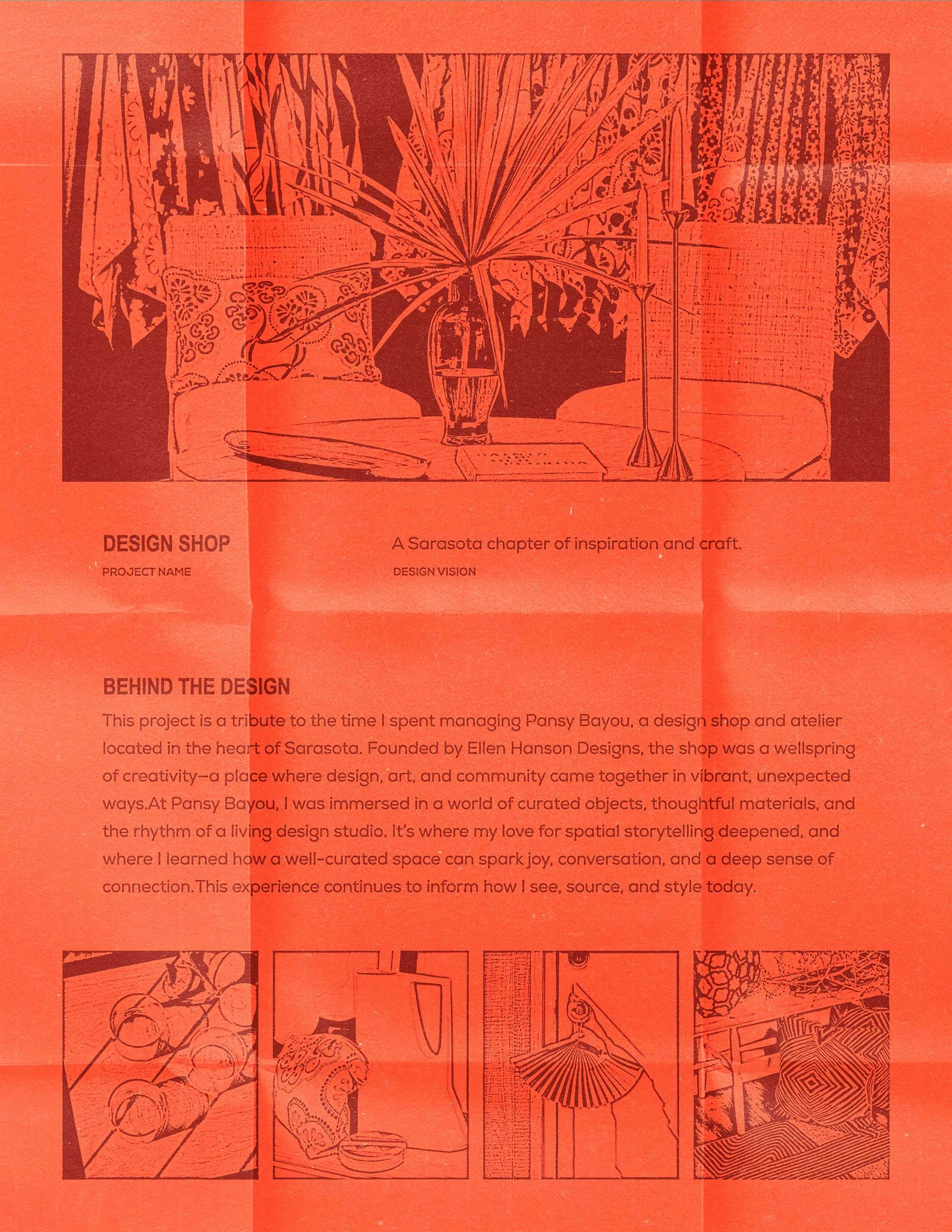 A printed page showcasing a design project for a Sarasota chapter of inspiration and craft, including a sketch of interior decor, a written description of the project's background, and four small images of various craft objects at the bottom.