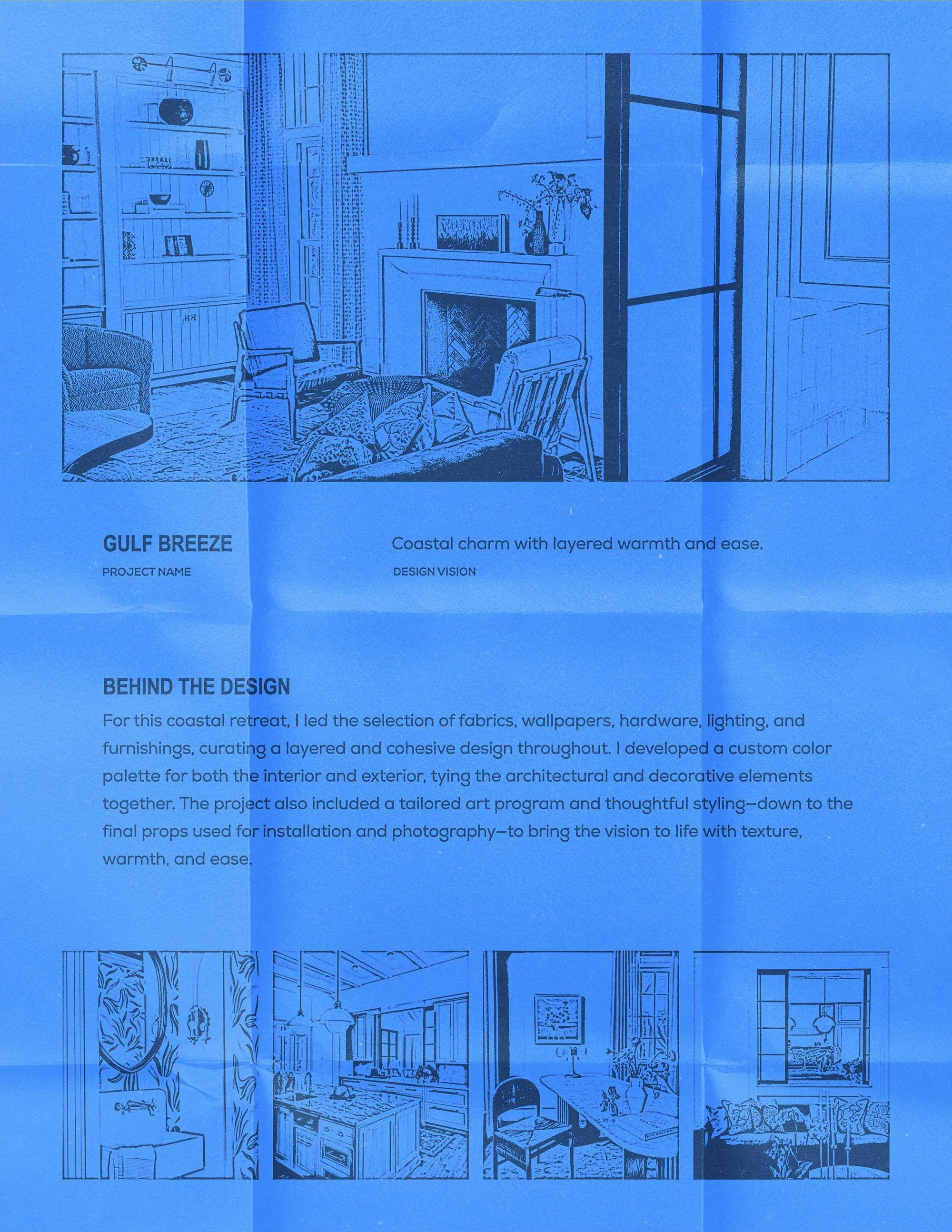 Blueprint of an interior living space with mention of a project called Gulf Breeze, describing a coastal charm design theme with layers of warmth and ease, including interior and exterior details, with sketches of furniture, decor, and architectural elements.